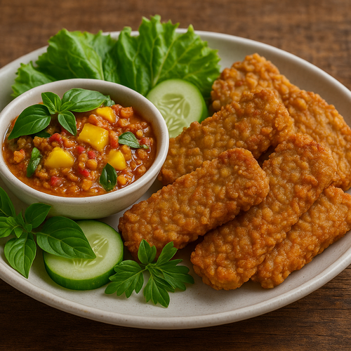 Irisan timun, daun selada, atau lalapan lain Sambal ekstra jika suka lebih pedas Langkah Memasak 1. Siapkan tempe Potong tempe tipis memanjang agar cepat matang dan renyah. Campur tepung terigu, tepung beras, maizena, garam, merica, dan kaldu jamur di mangkuk. Kocok telur dengan air dingin lalu tuang ke campuran tepung. Aduk sampai membentuk adonan kental (konsistensi seperti tempura — tidak terlalu cair, tidak terlalu padat). Tambah air sedikit demi sedikit jika perlu. 2. Lapisi dan goreng tempe Panaskan minyak dalam wajan deep fryer atau panci hingga 170–180°C. Celupkan setiap potongan tempe ke adonan tepung, pastikan tertutup rata. Untuk lapisan ekstra: gulingkan setelah celup pertama ke sisa tepung beras kering lalu celup lagi (double coating) untuk hasil lebih krispi. Goreng tempe dalam minyak panas hingga kuning keemasan dan renyah (±3–5 menit tergantung ketebalan). Tiriskan di rak kawat agar tetap krispi. 3. Buat sambal kacang mangga muda Tumis bawang putih sebentar hingga harum (atau gunakan mentah jika suka tekstur lebih segar). Campurkan kacang halus, potongan mangga muda, cabai rawit yang diulek halus, gula merah, kecap manis, dan air hangat. Aduk hingga mencapai tekstur sambal kental. Tambahkan air asem (jeruk nipis) dan garam. Koreksi rasa: seimbangkan asam-manis-pedas-gurih. Sambal harus terasa segar dengan sedikit renyah dari potongan mangga. 4. Penyajian Susun tempe krispi di piring saji. Sendokkan sambal kacang mangga muda di samping atau sedikit di atas tempe — agar sebagian tempe tetap renyah. Taburi daun kemangi atau ketumbar untuk aroma. Sajikan bersama lalapan dan nasi putih atau lontong. Tips & Trik (agar hasil maksimal) Teknik double-coating: Celup-tepung, keringkan sebentar, lalu celup lagi untuk lapisan ekstra renyah. Minyak panas stabil: Jaga suhu minyak; jika terlalu panas lapisan akan cepat kecokelatan tapi belum matang, jika terlalu dingin tempe menyerap minyak. Mangga muda: Pilih mangga yang masih agak keras, bukan yang terlalu masak agar tekstur crunchy dan asamnya pas. Sambal tekstur: Jika ingin sambal lebih halus, blender sebagian kacang; untuk tekstur, ulek kasar kacang. Versi vegan: Ganti telur dengan adonan tepung + air + 1 sdt mustard atau aquafaba untuk membantu ikatan. Variasi & Ide Menu Tambahkan serutan kelapa sangrai ke sambal untuk aroma tropis. Buat versi pedas manja: tambahkan selai mangga pedas untuk lapisan rasa manis-karamel. Potong tempe kotak, tusuk sate, goreng lalu oles sambal sebagai satay tempe krispi. Penyimpanan Tempe krispi: simpan dalam wadah tertutup saat dingin agar tetap renyah maksimal 2 hari. Panaskan di oven 180°C selama 5–7 menit untuk mengembalikan kerenyahan. Sambal: tahan 2–3 hari di kulkas dalam wadah kedap udara; mangga akan sedikit melunak. Pairing & Saran Penyajian